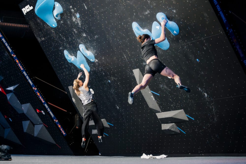 Für einige Boulder brauchten die Damen nur wenige Sekunden. Das zweite Problem toppte Wettkampfikone Janja Garnbret in unglaublichen 45 Sekunden. Gesamtsiegerin Oriane Bertone brauchte sogar nur 30 und die Amerikanerin Annie Sanders holte sich den Top in einer Minute.
