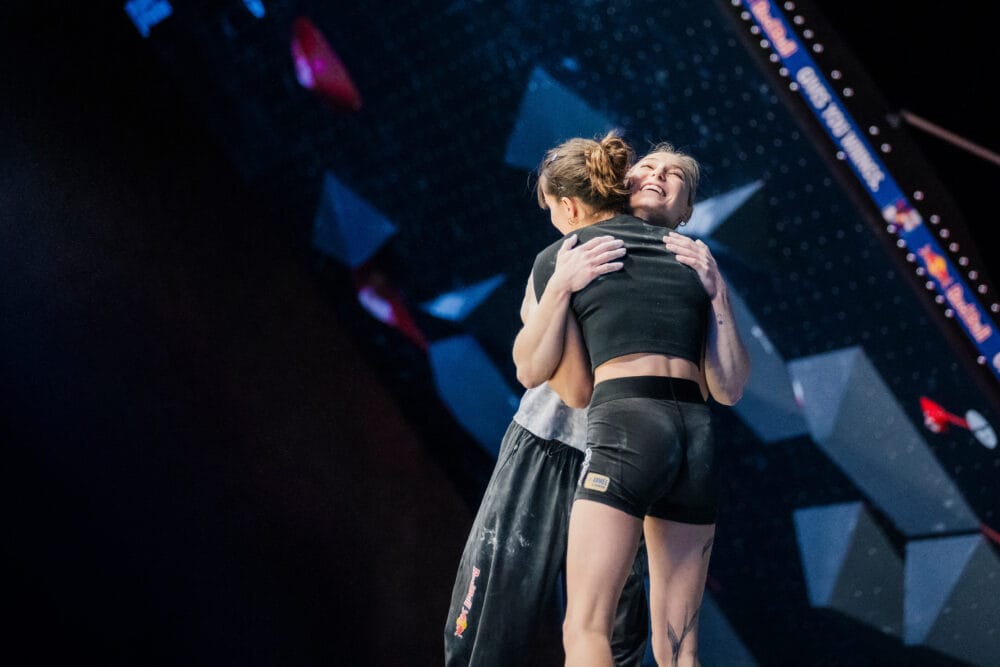 Noch schneller ging die Finalrunde der Damen. Am letzter Boulder des Abends standen sich die zweifache Olympiasiegerin Janja Garnbret und Vize-Weltmeisterin Oriane Bertone gegenüber und in gerade mal 19 Sekunden war der Sieg entschieden. Garnbret verlor in der dynamischen Sequenz weiter unten entscheidende Sekunden und viel beim ersten Versuch. Bertone kämpfte sich durch und gewann das Event mit einem Flash-Go im Finale. Im kleinen Finale der Damen setzte sich die Amerikanerin Annie Sanders gegen Britin Erin McNiece durch und sicherte sich damit den dritten Platz.