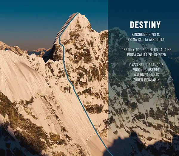 Benjamin Zörer and Lukas Waldner is the first ascent of Kimshung (6.781 m) in the Langtang Himal, Nepal, succeeded. Together with François Cazzanelli and Giuseppe Vidoni, they climbed the new route "DESTINY" (TD, 1.300 m, 60°, AI4, M5) on the northeast face.